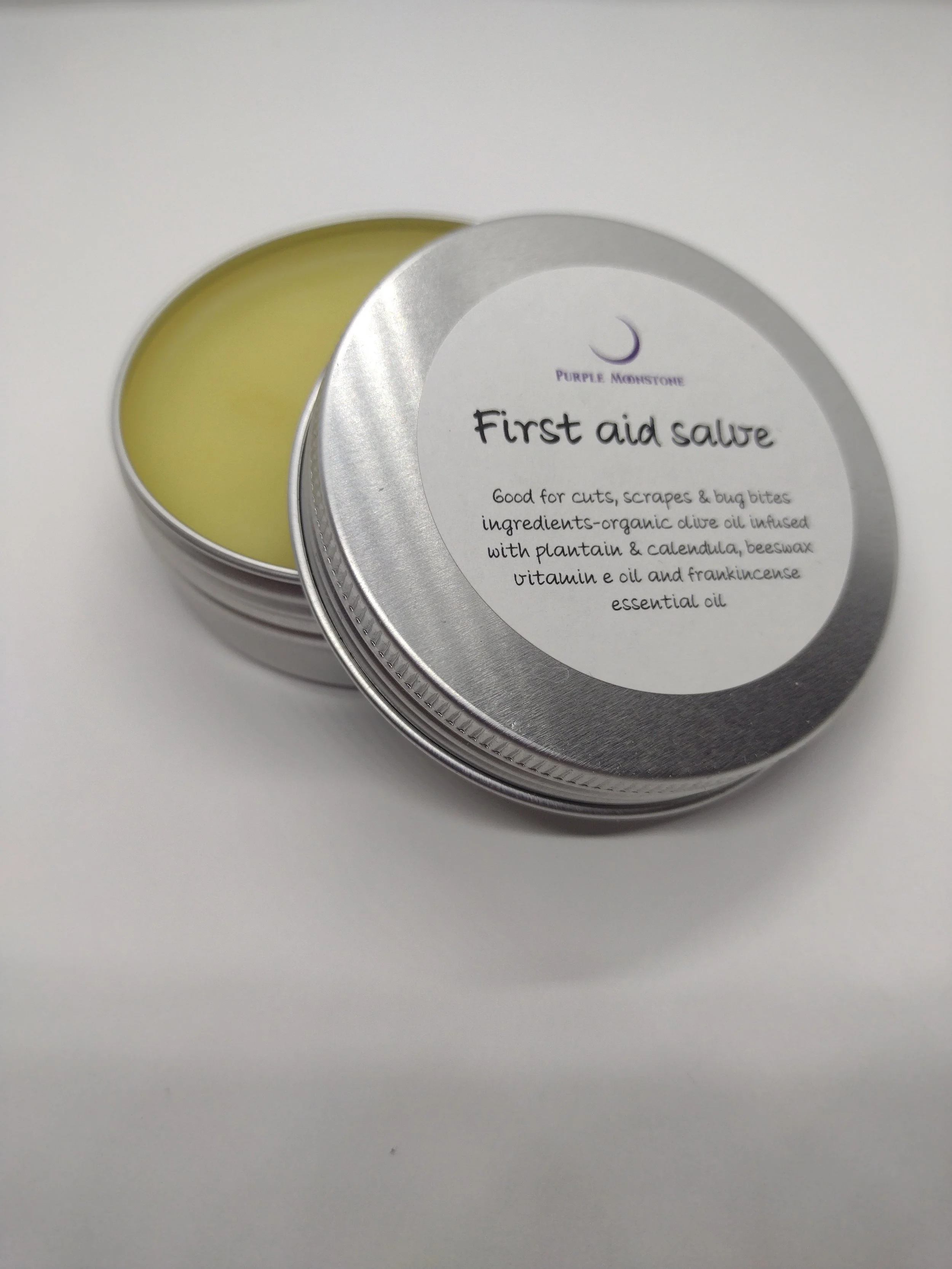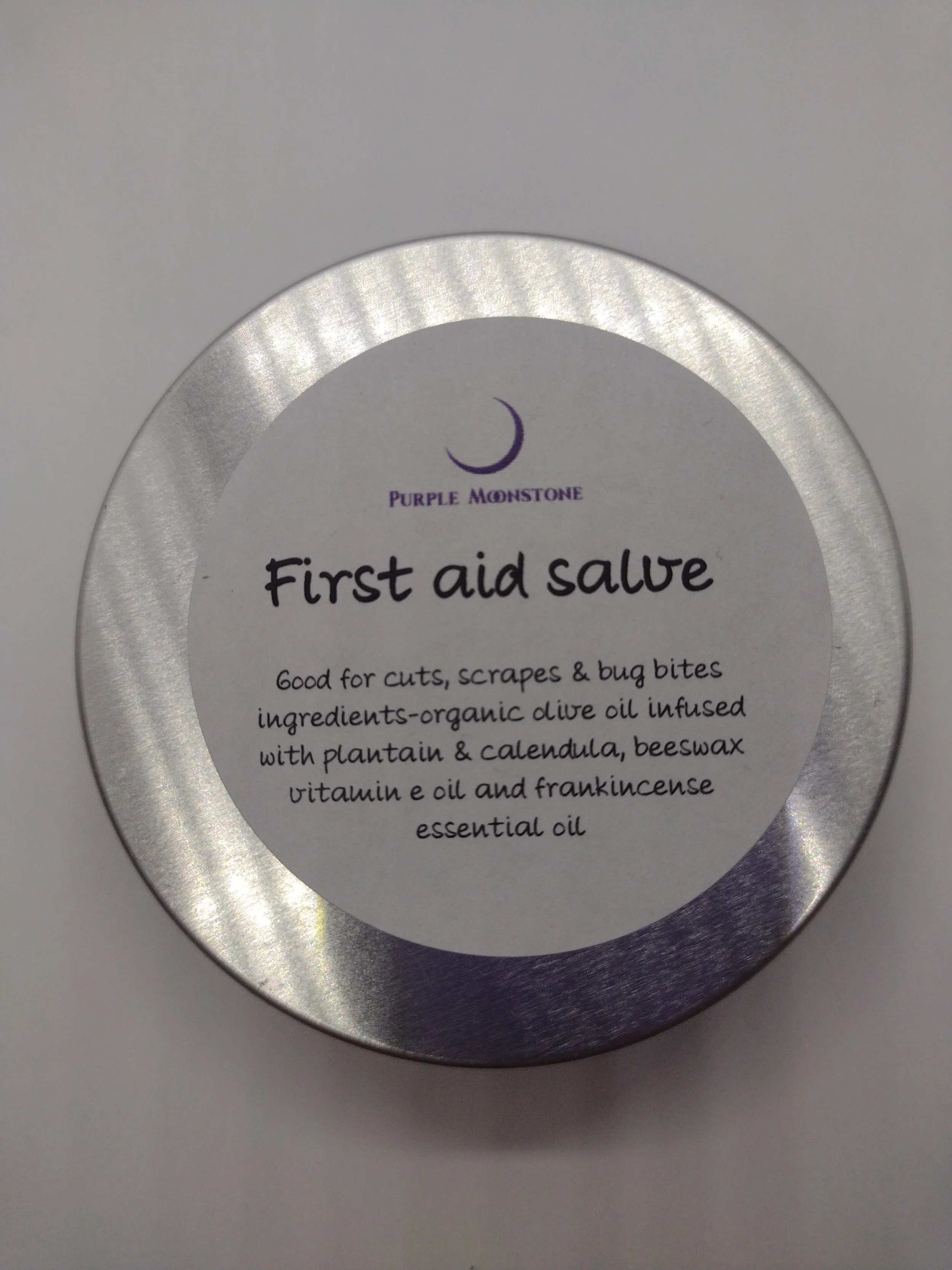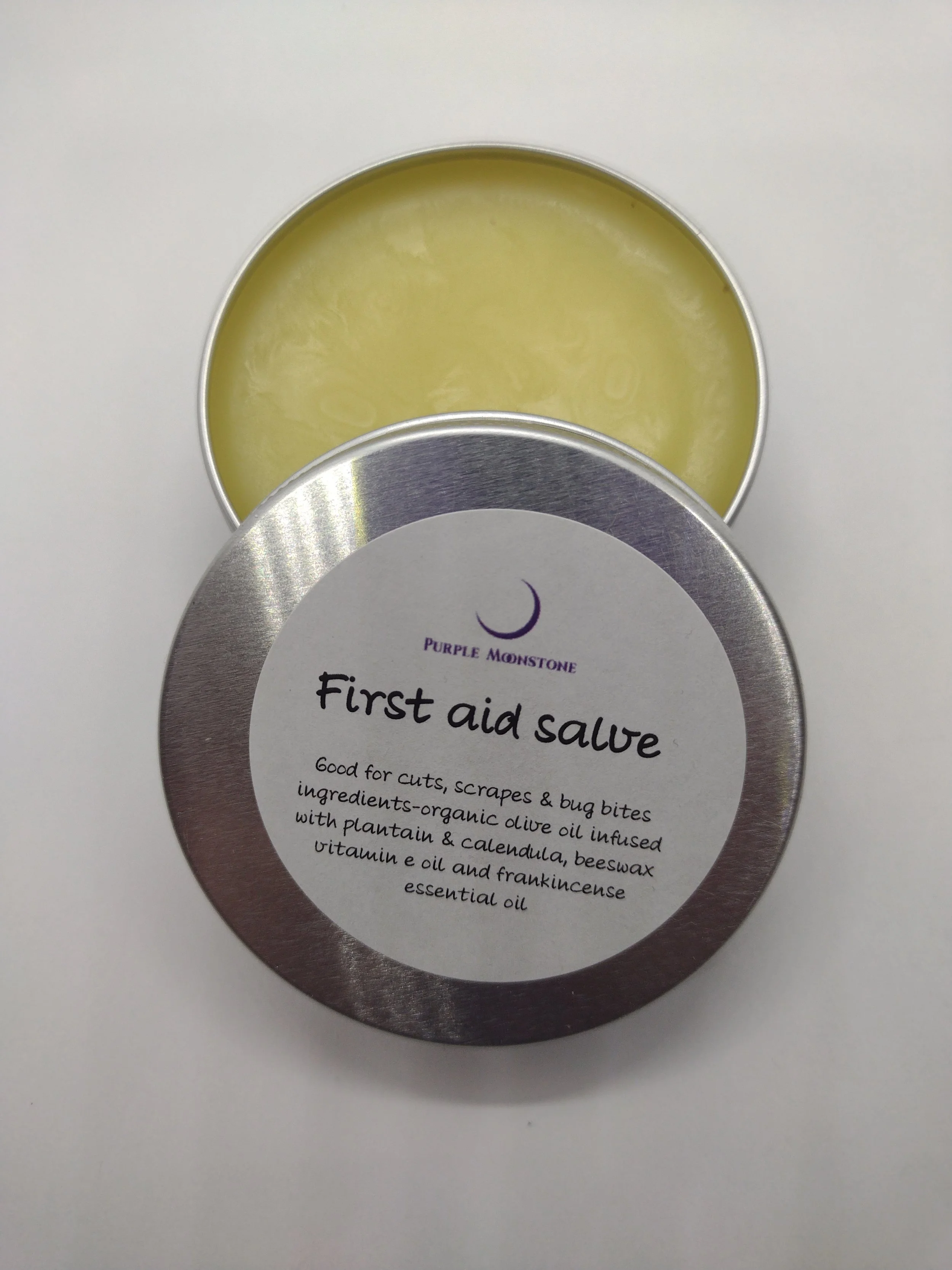 First Aid Salve - Good for cuts, scrapes, bug bites, dry skin. Ingredients- organic olive oil infused with plantain & calendula, beeswax, vitamin e oil, and frankincense essential oil.